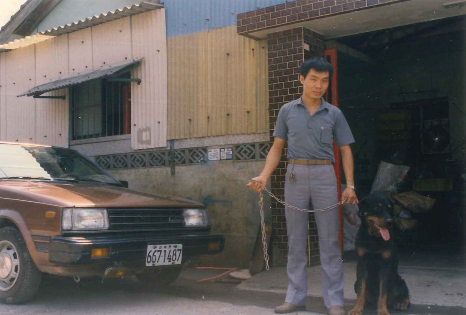 Cosda’s founder, Mr. Liu, and his Rottweiler, posed in front of the old Cosda factory in Taichung, 1989