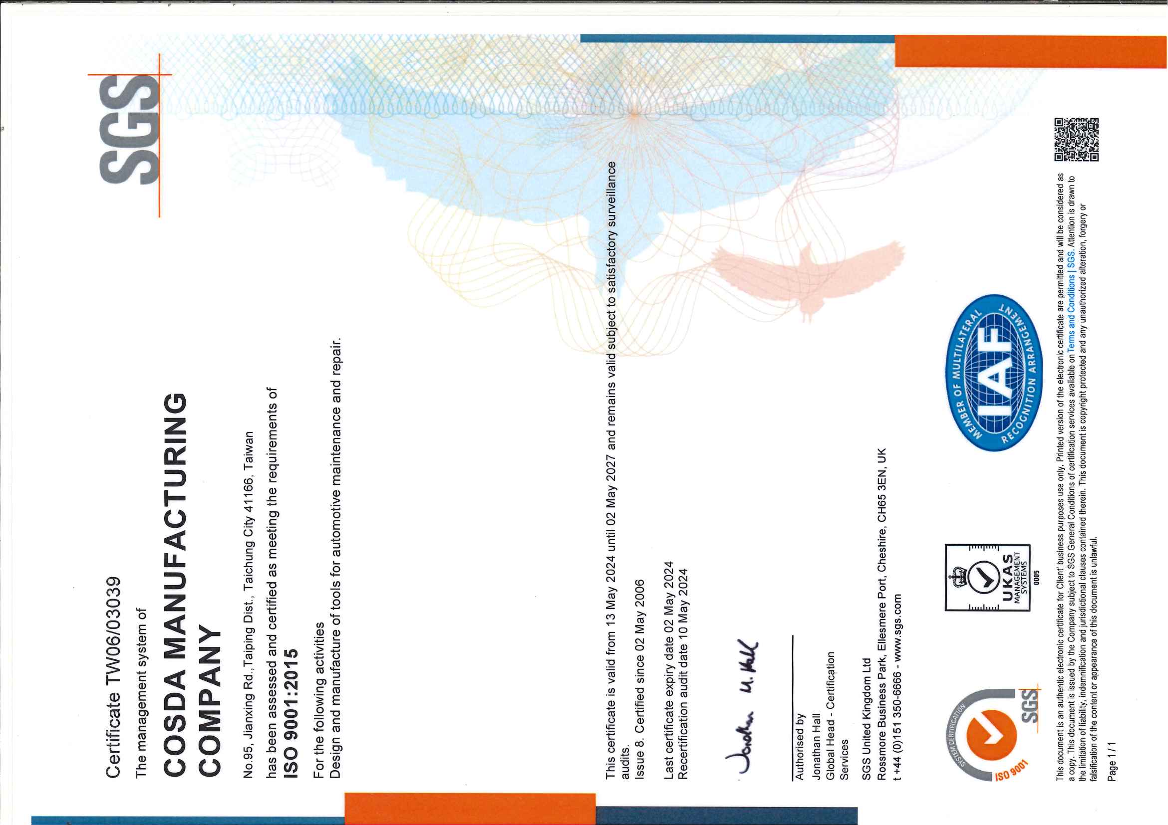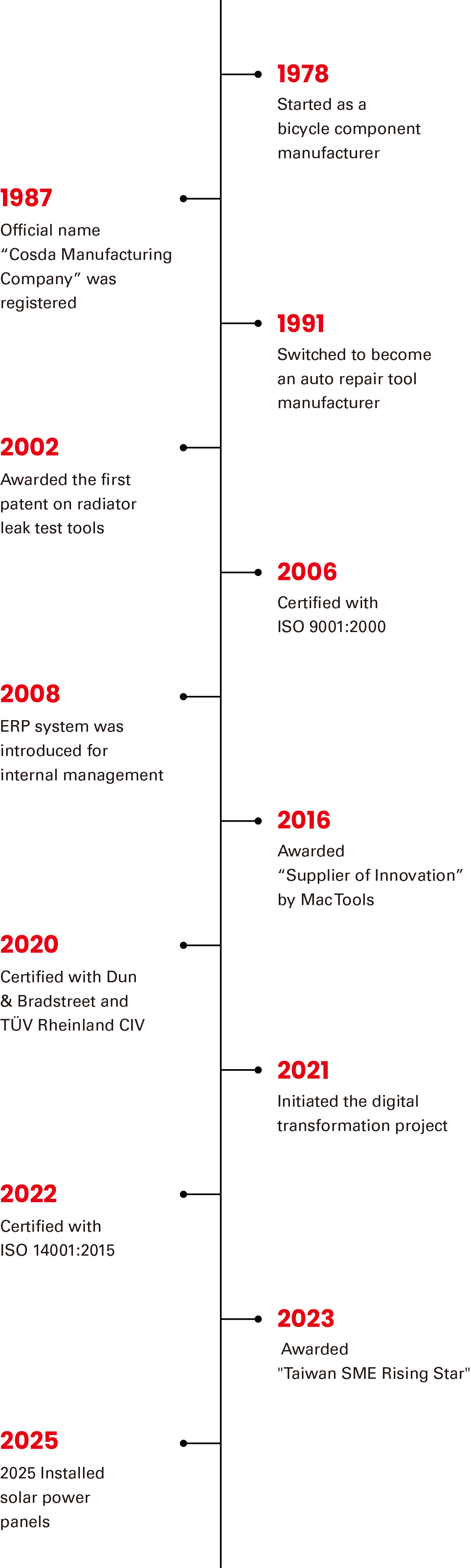 Cosda Manufacturing Company is a leading specialty tool manufacturer in Taiwan, and renowned for its innovation and excellent service. Cosda is a family-owned company with more than 40 years of history. In the first decade, Cosda was a micro bicycle component manufacturer with only a couple of milling machines, and by chance, the founder - Mr. Liu bought an auto repair tool to use on his car, but he found the tool had much to improve, so he did.